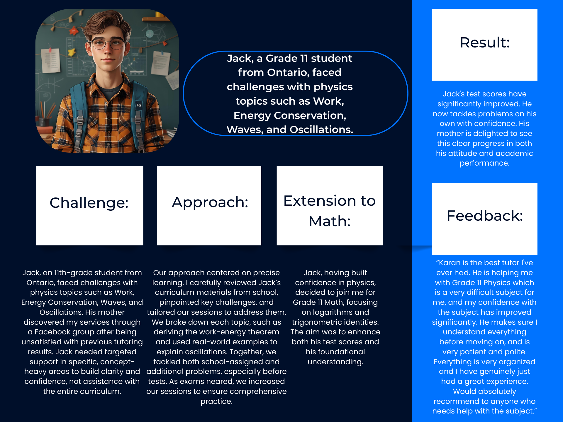 Jack, a Grade 11 student from Ontario, was struggling with Work, Energy, Waves, and Oscillations. Calm explanations, visual diagrams, and targeted practice helped him turn Physics into one of his strongest subjects.