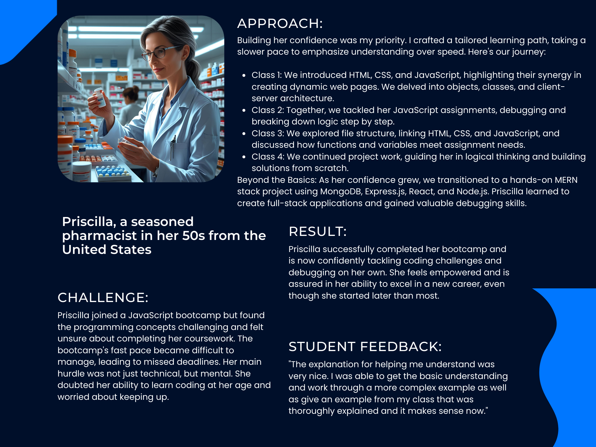 Rohan, an 11-year-old from the USA, was curious about coding but overwhelmed by syntax-heavy lessons. A structured, visual-first approach helped him build real programming logic and renewed excitement.