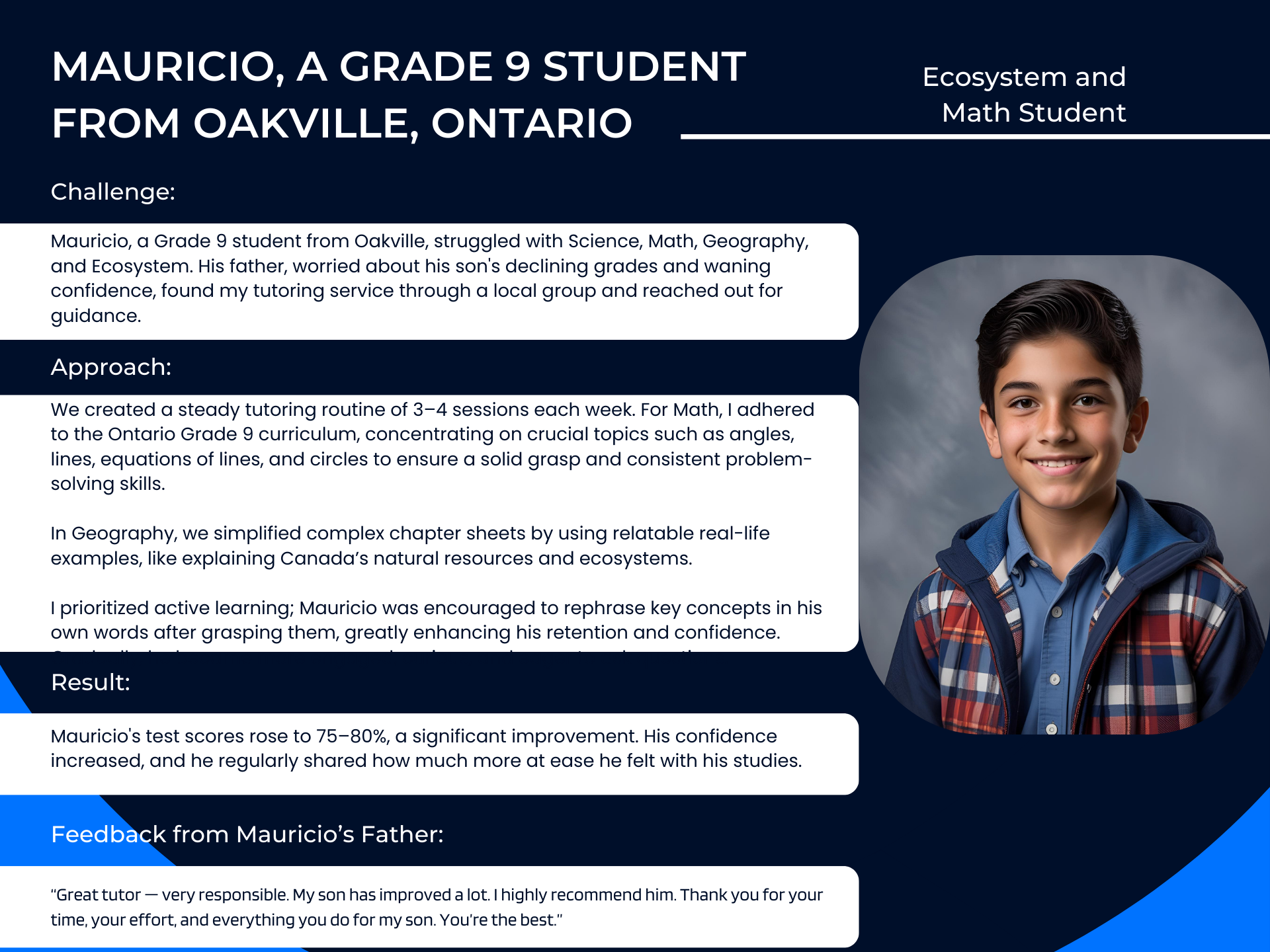 Mauricio was falling behind in Math, Science, and Geography. With a weekly routine and patient teaching, he regained confidence and caught up across multiple subjects.