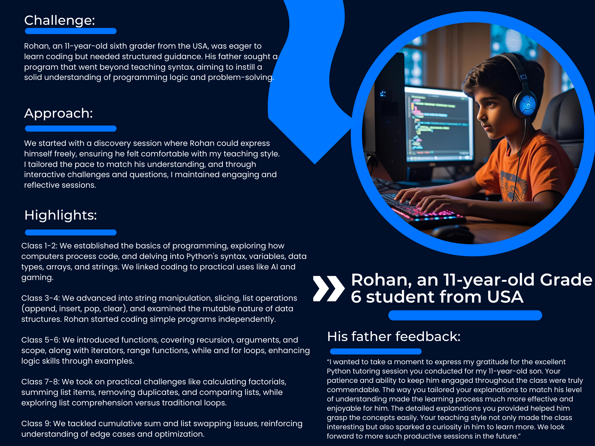 Rohan, an 11-year-old from the USA, was curious about coding but overwhelmed by syntax-heavy lessons. A structured, visual-first approach helped him build real programming logic and renewed excitement.