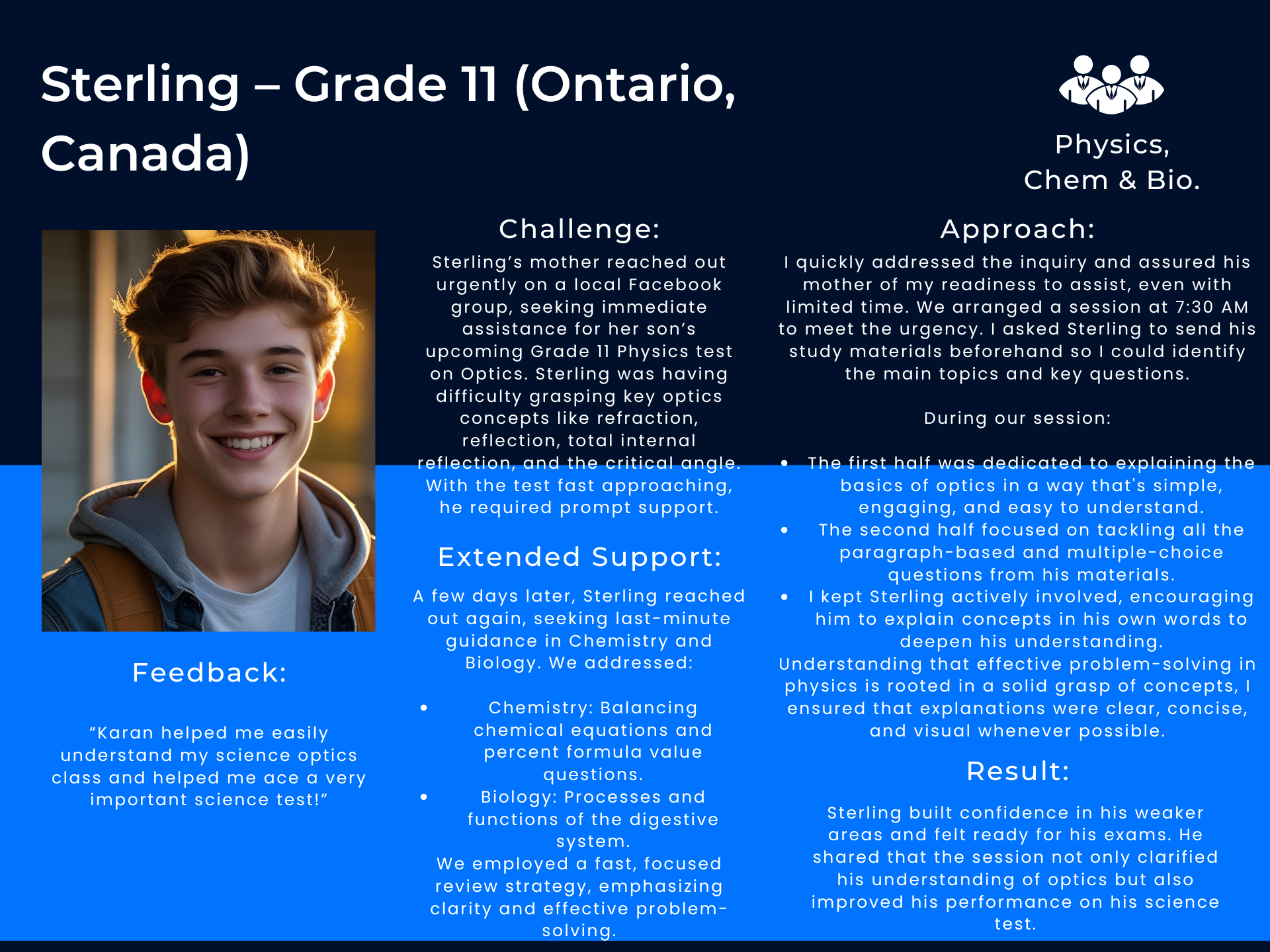 Jack, a Grade 11 student from Ontario, was struggling with Work, Energy, Waves, and Oscillations. Calm explanations, visual diagrams, and targeted practice helped him turn Physics into one of his strongest subjects.